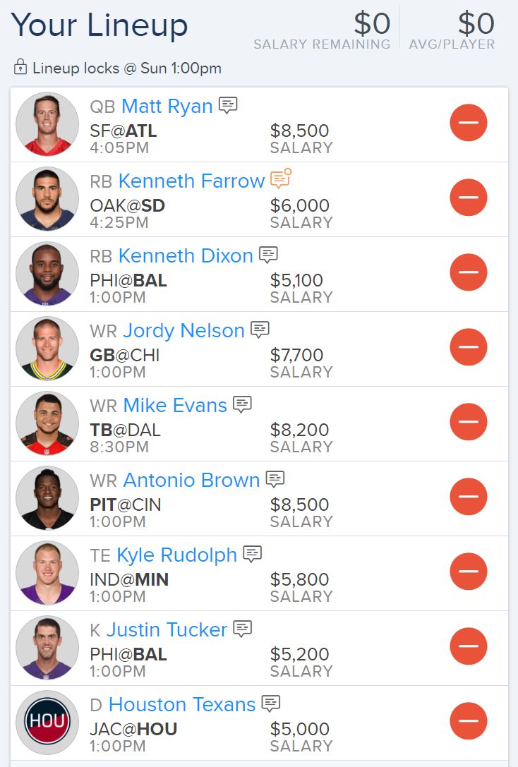 The second lineup focuses on the WR position by including 3 of the top 10 WRs in the game, Antonio Brown, Mike Evans and Jordy Nelson. Brown is the model of consistency, as he always manages to find a way to get fantasy points. He’s averaging the most receptions per game (7.2) from the second most targets per game (10.6) of any WR in the NFL, so far totaling 1,130 yards and 11 TDs. The Bengals are more vulnerable on the ground, but Brown is essentially matchup proof. Evans is facing a bottom 5 Cowboys pass defense and is Jameis Winston’s number 1 target. In fact, he has the most targets of any WR in the NFL this year (146). The Bears defense has been surprisingly effective in recent weeks, but Nelson is still Aaron Rodger’s favorite target, and he leads the league in receiving TDs (12). And the reason he leads the league in receiving TDs is that Jordy also leads the league in both red zone targets (26) and targets inside the ten-yard line (14). Plus, it’s become pretty clear that the Packers don’t have much on the ground, so Rodgers will have to keep passing to ensure a W.