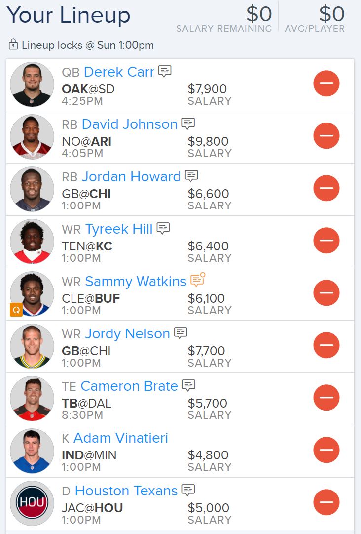 The first lineup focuses on the RB position by slotting in the top (and most expensive) RB choice in David Johnson and a solid RB2 in Jordan Howard.