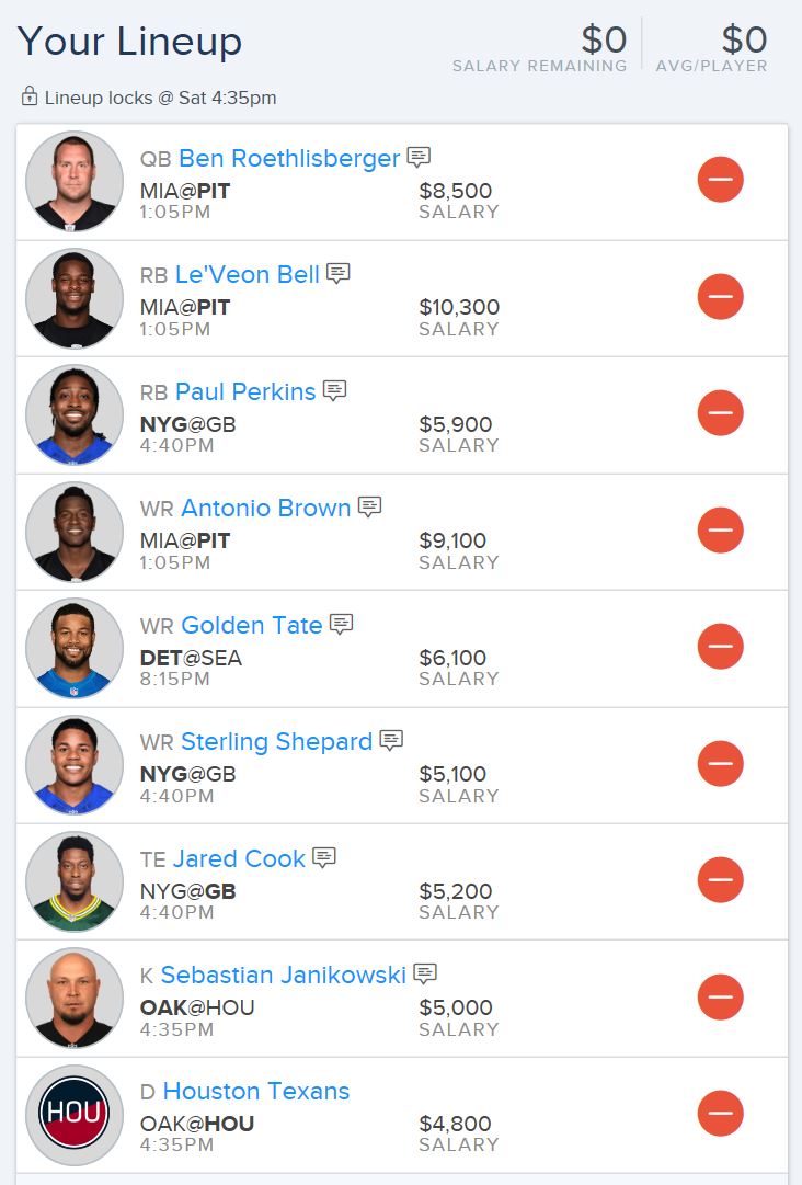 Well, I’ve walked through a breakdown of the Dolphins @ Steelers, but the bottom line is that the Dolphins have 20th ranked defense per DVOA on Football Outsiders and have struggled in pass coverage as well as stopping the run. And don’t forget that Ben loves being at home, as he averages of 2.95 TDs and 339.05 yards per game at Heinz Field. As for Bell, well, there’s nothing more to say other than he’s the chalk play of the week. Find a way to fit him in your lineup. Plus, the Steelers defense isn’t so hot either, leading to this game having the highest over/under of any game this weekend (46), meaning that there should be plenty of motivation for the Steelers to keep to foot on the gas, in addition to getting revenge for the Week 6 drubbing in Miami.