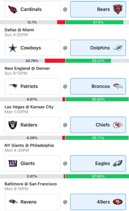 The Bills are on the rise with wins over the Chiefs and Cowboys, narrowly missing out on beating the Eagles 3 weeks ago. The Chargers are going in the exact opposite direction after losing Justin Herbert, getting stomped by the Raiders and then getting their head coach and GM fired. They’ll be out there again without Keenan Allen and with an underwhelming Easton Stick under center backed up by a all-but-done Austin Ekeler. Don’t overthink it. Lock it in.