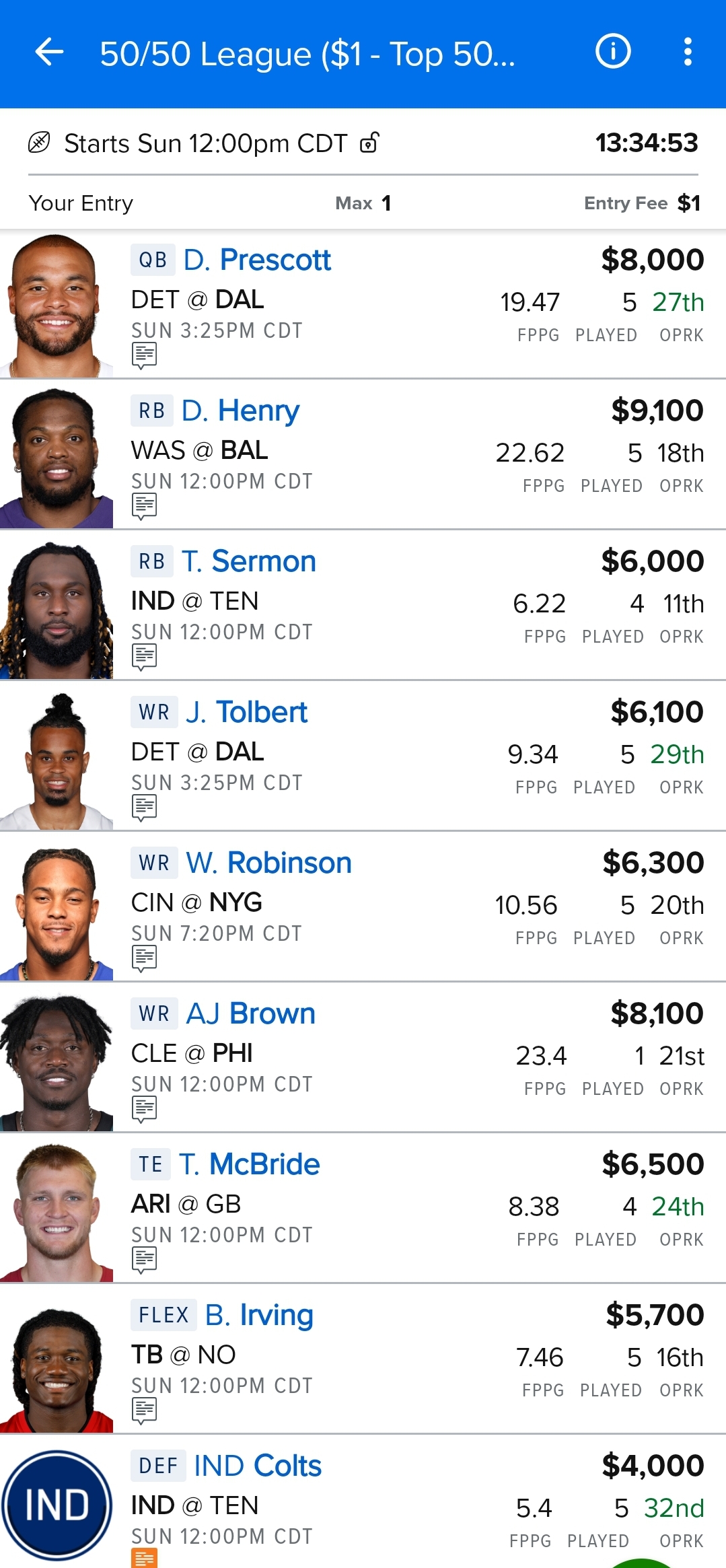 - The Detroit Lions @ Dallas Cowboys game has the highest over/under of the main slate (52.5), so there’s plenty of opportunity here. Since the Lions have the 7th most rush yards per game (151.3) and the Cowboys allow the 8th most rush yards per game (135.0) and the 2nd most rushing TDs (8) of any team in the NFL, I’m in on both Jahmyr Gibbs and David Montgomery. And since the Cowboys have the 3rd most passing yards per game (271.6) of any offense in the NFL and the Lions allow the 6th most passing yards per game (258.3) to opposing offenses, all Dallas passing and receiving options are in play including Jalen Tolbert, Jake Ferguson, Dak Prescott and CeeDee Lamb, in that order based on value and upside. Tolbert was great playing WR2 last week with Brandin Cooks out catching 7 targets for 87 yards and TD, and his pricing hasn’t caught up, so I’m fan of using him to save cap space. And Ferguson makes for a solid TE play seeing as how he’s consistently had 6 receptions in 3 straight games. That’s fantastic for full PPR sites like Draft Kings.